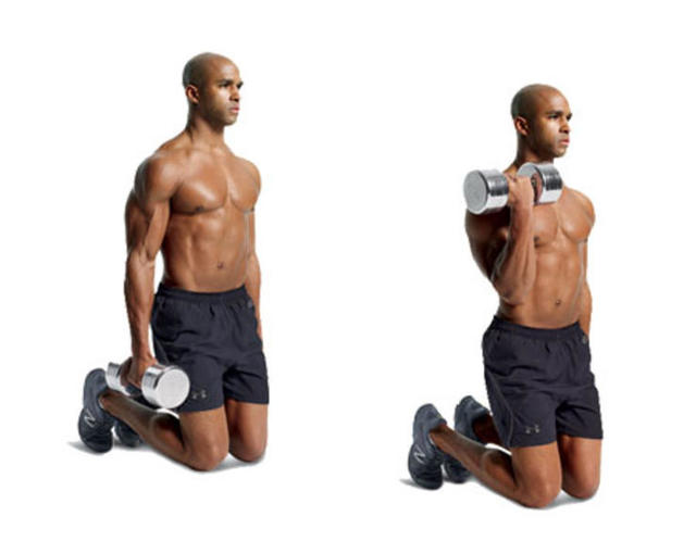 Step1:半跪在地上,跪地一邊的手握住一隻啞鈴,上身保持平直,目視前方。這是動作的起始位置。