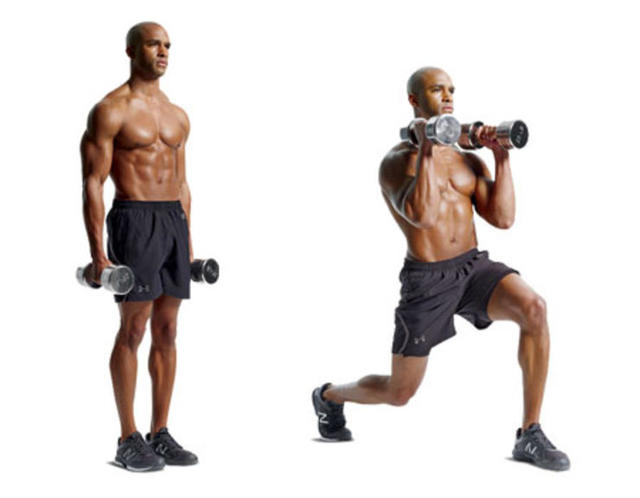 Step2:一邊前腿為支撐,另一邊腿向後蹲下,捲曲前臂緊貼肩膀,做完後放下雙手。兩腿互換位置,重複以上動作。每組10次,每次8套,每組之間休息30秒。