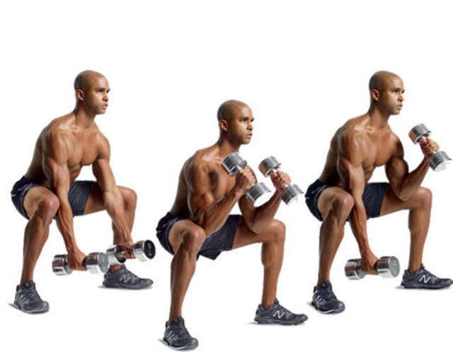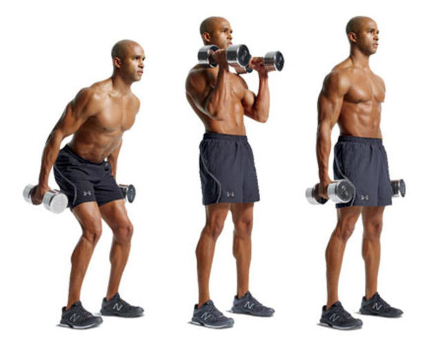 Step2:膝蓋和臀部稍微彎曲,以爆炸性的力量將啞鈴抬起肩膀,稍作停頓後慢慢放下,休息5秒之後再次重複。每組5次,每次3組,每組之間休息90秒。
