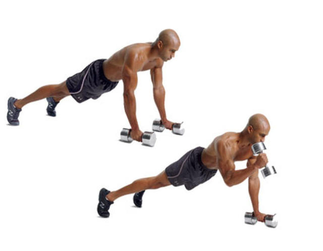 Step1:兩手抓住啞鈴,用雙臂支撐身體與地面垂直,兩手距約與肩同寬,挺胸、收腹、緊腰,腳尖部位撐地,全身挺直。